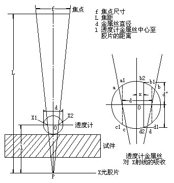 连接胶片上P点与焦点两端,设两直线与以O为原点的直线的横轴分别交于x1和x2,则x1和x2之间的距离d'可用下式表示:d'=f•l/L,式中:l--金属丝中心至胶片距离;L--焦点至胶片距离。