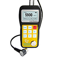 OU1600超声波测厚仪对厚度的测量,是由探头产生超声波脉冲透过耦合剂到达被测体,一部分超声信号被物体底面反射,探头接收由被测体底面反射的回波,精确地计算超声波的往返时间,并按下式计算厚度值,再将计算结果显示出来。