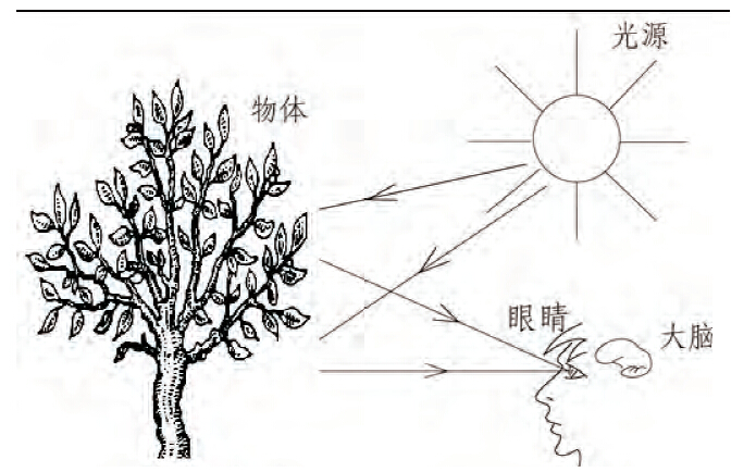 颜色是指观察者通过眼、脑和已有的生活经验所产生的一种对光的视觉效应。颜色,实质上是一个动态的视觉过程,颜色视觉过程主要有光源、物体、人眼、大脑四个要素,如图1 所示。光源发出的不同光谱组成的光照在物体表面,经过物体对光选择性地吸收、反射或透射之后作用于人眼,由人眼内视细胞将光刺激转换为神经冲动并通过视神经传入大脑,再由大脑内视觉中枢判断产生关于该物体的颜色感觉。颜色有三个特性,即明度、色调、饱和度(2)。明度是指一种主波长的光谱色被白光冲淡的程度,实质上是表示了主波长光谱色的三刺激值在样品三刺激值中所占的比重(3),是指色彩的明暗程度。每一种颜色在不同强弱的照明光线下都会产生明暗差别,物体的各种颜色,必须在光线的照射下,才能显示出来。色调,也称色相,是色彩所具有的最显着特征,就是指不同颜色之间质的差别,它们是可见光谱中不同波长的电磁波在视觉上的特有标志。饱和度( 也称饱和纯度、色纯度) ,是指构成颜色的纯度也就是彩色的纯洁性﹐色调深浅的程度(4)。它表示颜色中所含彩色成分的比例。彩色比例越大,该色彩的饱和度越高,反之则饱和度越低。