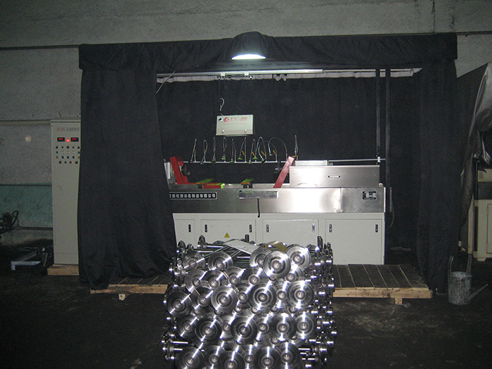 本设备采用手动、自动两种运行方式,由可编程控制器(OMRON PLC)集中控制。手动时,可进行每个功能的单步独立操作;自动时,设备自动执行PLC内部程序,工件上料到位夹紧后,按启动按钮,可实现工件的转动——喷淋——磁化——二次转动观察等一系列动作。手动退磁后松开工件。周向磁化采用直接通电,纵向磁化采用两组异形结构的线圈,具有良好的磁化效果。交流磁化均带断电相位控制,具有较好的剩磁稳定度,既适用于连续法探伤检查,又适用于剩磁法探伤检查。复合磁化在工件上形成旋转磁场,一次性全方位显示磁迹,具有较高的工作效率。