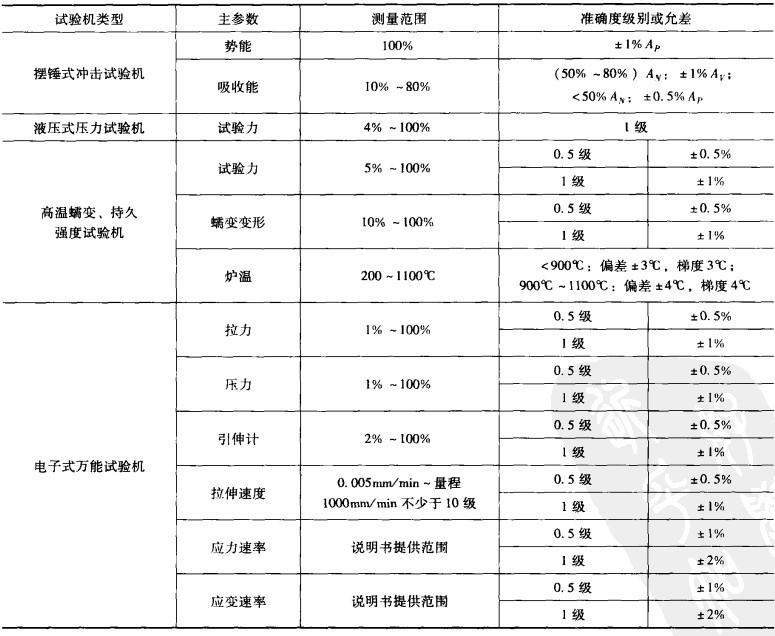 上述试验力规格、量程范围的确定方法对其他类型或者测量项目的指标选择具有普遍指导意义。同样,了解不同试验机各项技术指标的测量范围对用户来说是非常有帮助的。我们一摆锤式冲击试验机,液压式拉力试验机、高温蠕变、持久强度试验机和电子式万能试验机为例,通过下图看出不同类的试验机具有不同技术指标,每项技术指标都有相应测量范围及误差限或扩展不确定度。