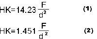 式中:F - 试验力(式1中F的单位为kgf,式2中F的单位为N);d - 压痕长对角线长(mm)。